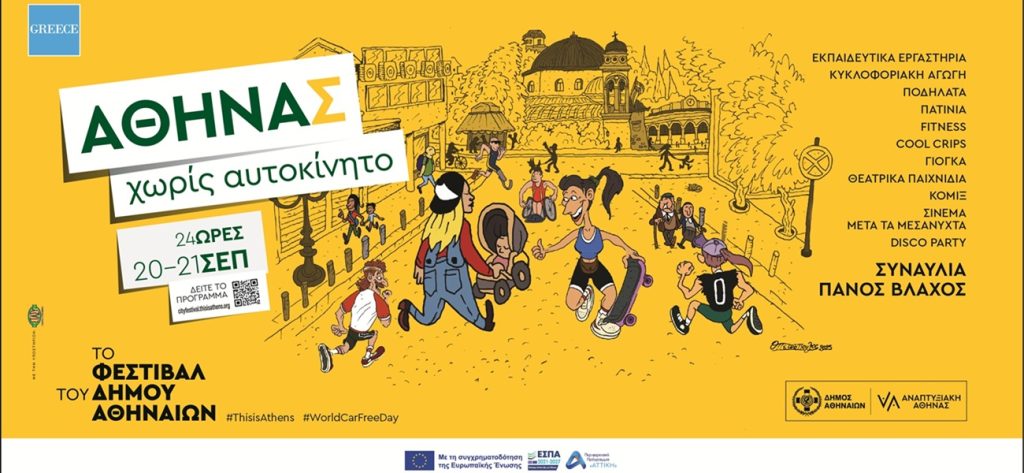 Η Παγκόσμια Ημέρα Χωρίς Αυτοκίνητο (22 Σεπτεμβρίου) γίνεται αφορμή για μια μεγάλη ανοιχτή γιορτή στο κέντρο της πρωτεύουσας. Για 24 ώρες, από το Σάββατο 20 Σεπτεμβρίου στις 20.00, έως τις 22.00 βράδυ της Κυριακής 21 Σεπτεμβρίου, το Φεστιβάλ του Δήμου Αθηναίων μεταμορφώνει την οδό Αθηνάς – από την Ευριπίδου έως το Μοναστηράκι – σε έναν ζωντανό χώρο πολιτισμού, άσκησης, παιχνιδιού και δημιουργίας, χωρίς αυτοκίνητα και μηχανάκια.